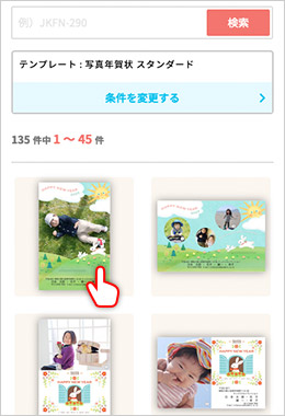 ① テンプレートデザインの写真適用エリア(グレーのエリア)をタップし画像を追加します。