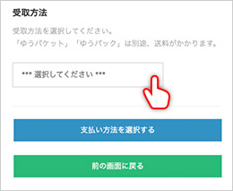 受け取り方法を選択して「支払い方法を選択する」ボタンをタップし、次の画面で「お届け先」、「支払い方法」を選択して注文手続きを完了してください。