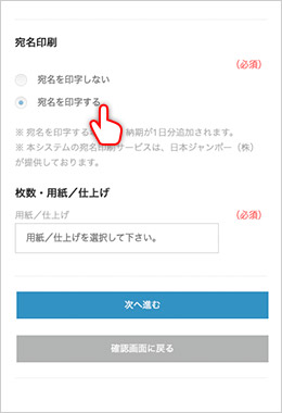 「宛名に印字しない」にチェックをし、画面表示に従って、枚数、用紙/仕上げを選択してください。